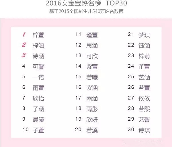 日前,中國首份姓名大數據報告《2016大數據“看”中國父母最愛給寶寶起什么名》新鮮出爐,2016年女寶熱名前三為梓萱、梓涵、詩涵,男寶熱名前三為浩然、子軒、皓軒。中國前100個重名率最高的名字,在全國覆蓋的人口超過10%。影視劇和綜藝節目對新生兒起名有影響。