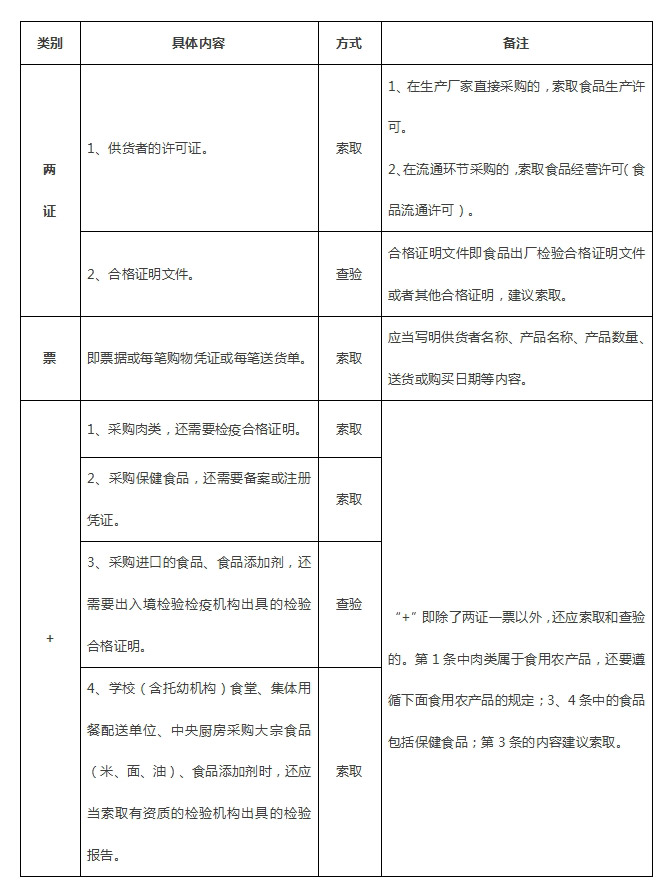 1、所謂“兩證一票+”即為:所有的食品(原料)等,采購時均需索取兩個證和一個票。特殊的食品還要索?。锏膬热?。